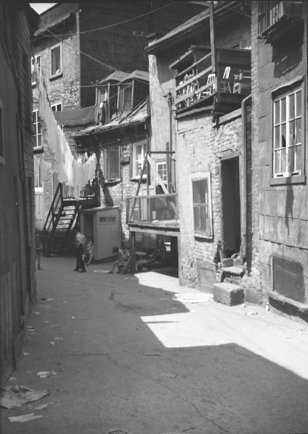 Vieux-Québec : enfants qui jouent dans la rue Sous-le-Cap, corde à linge