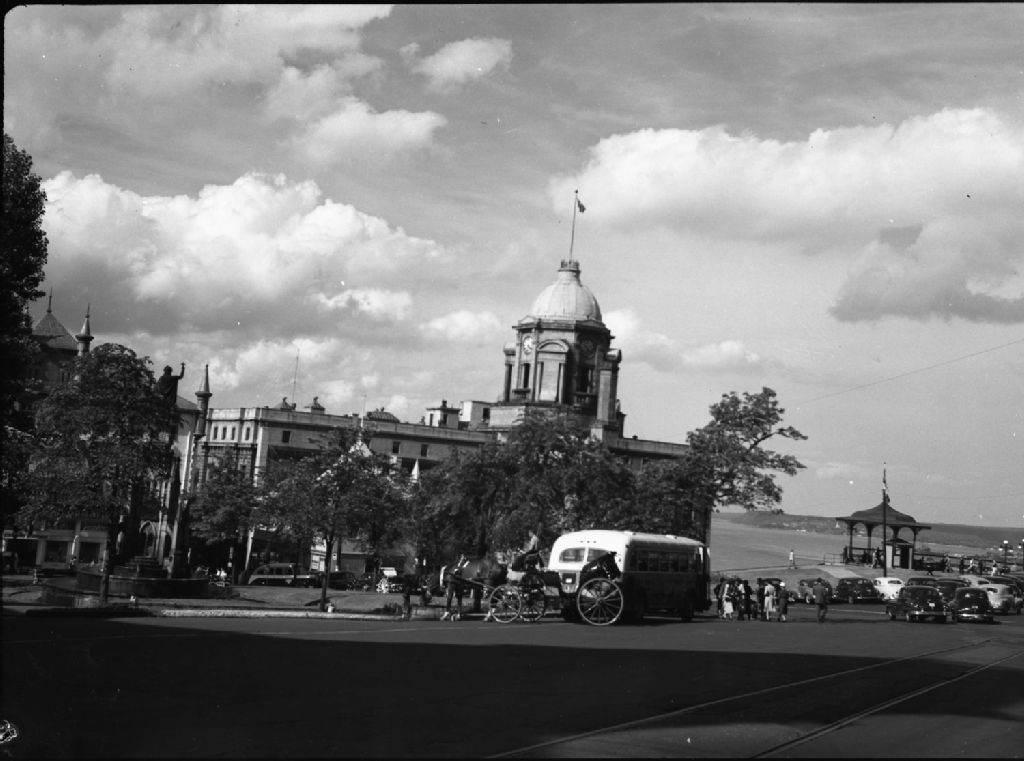 Vieux-Québec : Place d'Armes, bureau de poste, autobus, automobiles et piétons, Vers 1950, Archives nationales à Québec, Fonds George A. Driscoll, (03Q,P630,S17,D9849), George A. Driscoll.