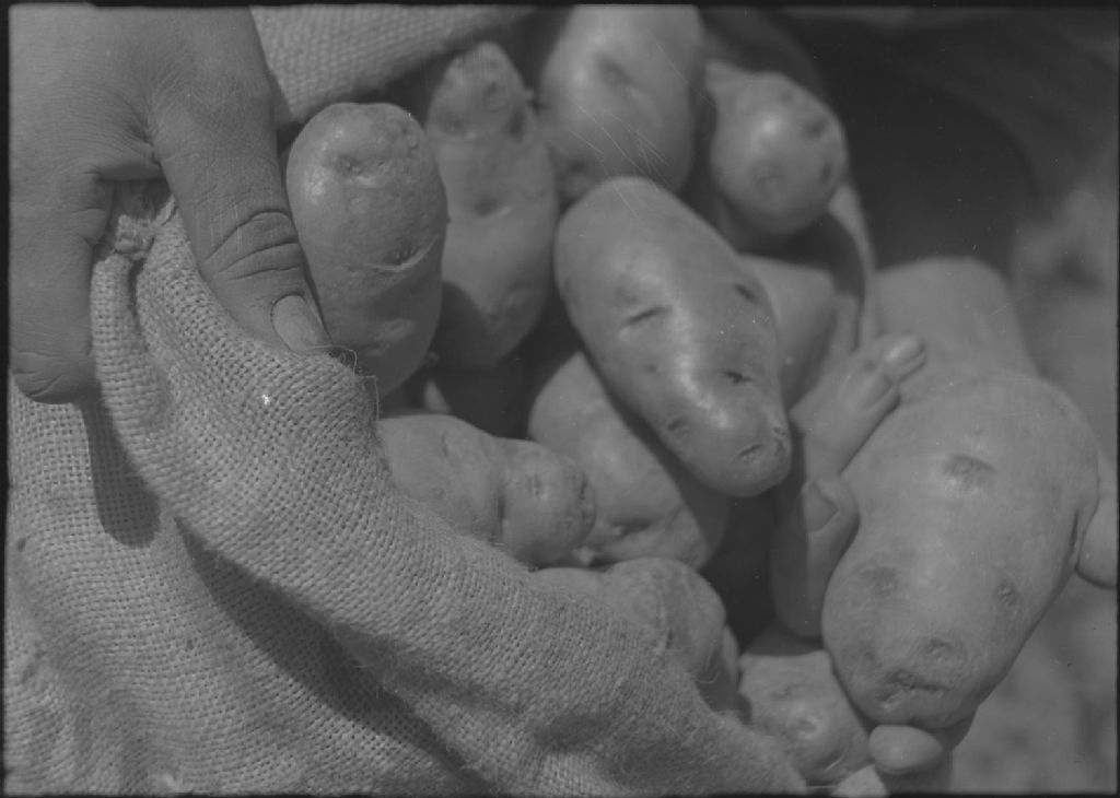 Île d'Orléans : pommes de terre dans une poche en jute.