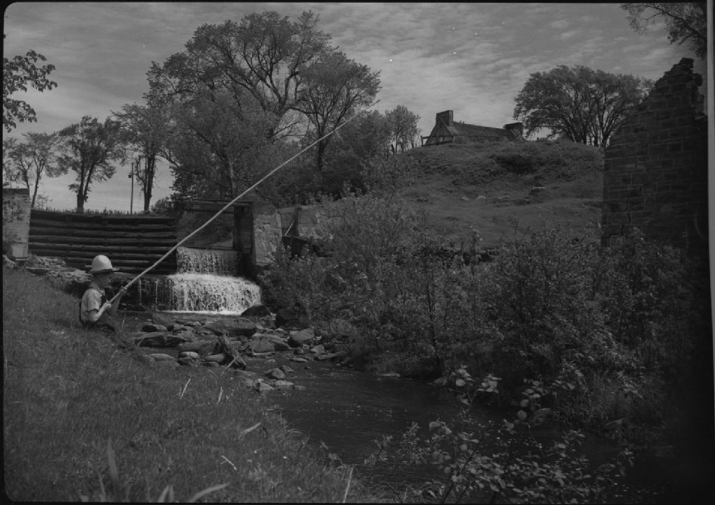 Sainte-Geneviève-de-Batiscan : un garçon pêche dans un ruisseau près d'une écluse