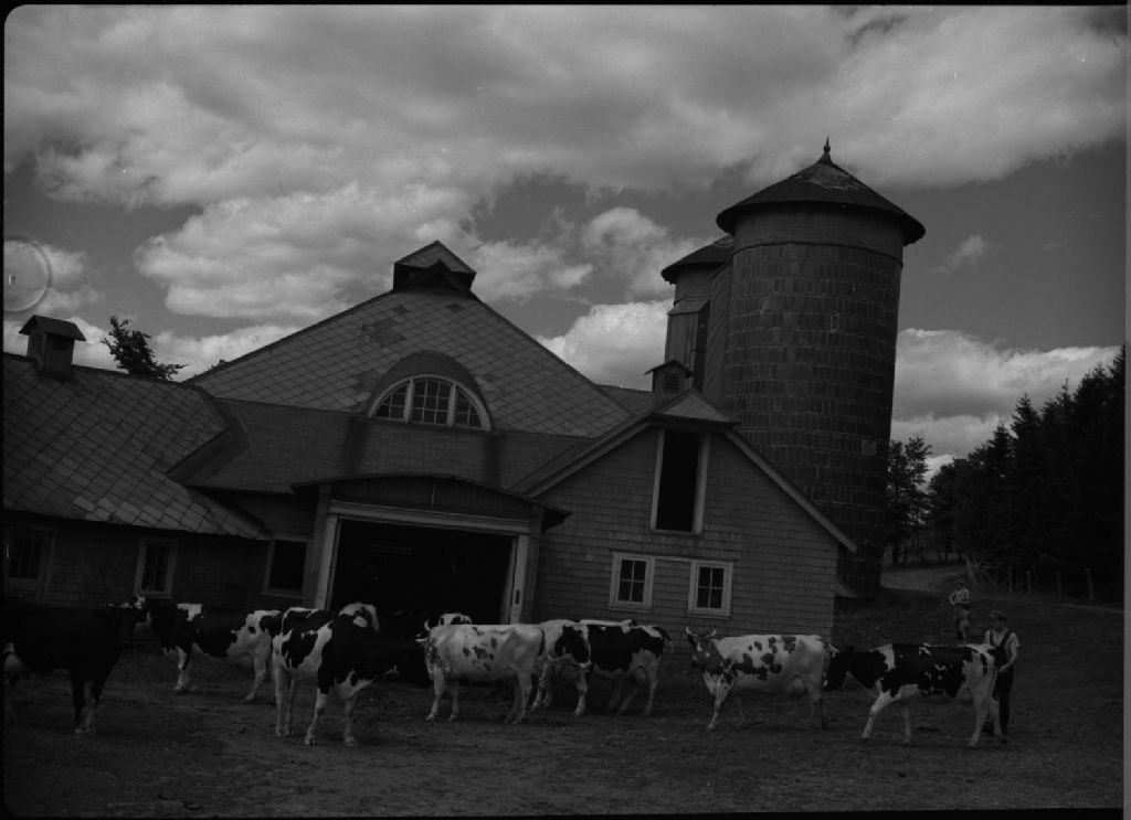 Grand-Mère : troupeau de vaches devant une étable.