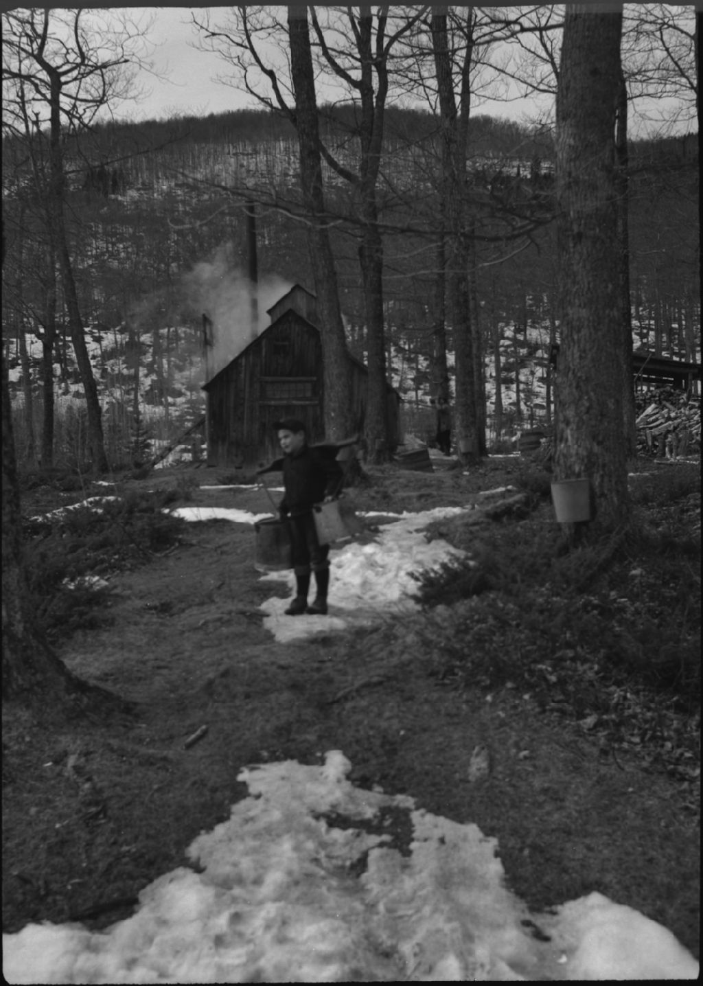 Petite-Rivière-Saint-François : un garçon transporte des seaux d'eau d'érable avec un joug
