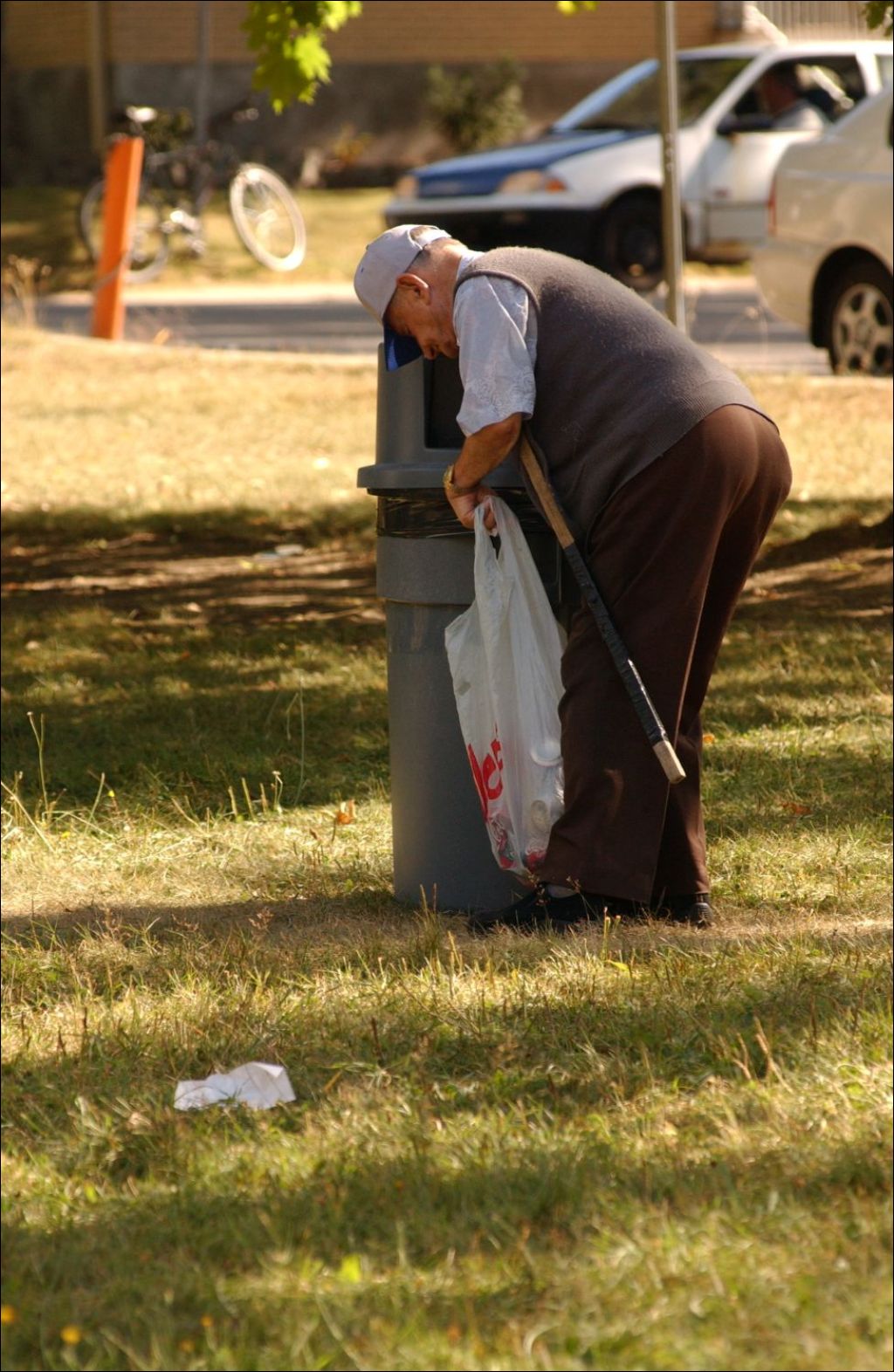 Vieillesse: une personne âgé fouille dans une poubelle, 2002-09-07, Archives nationales à Québec, Fonds Steve Deschênes, (03Q,P863,S2,D985), Photographe non identifié.