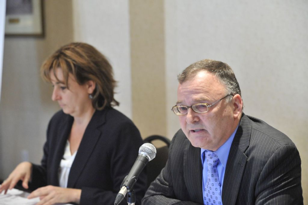 Conférence au sujet du projet de réaménagement du manège militaire: Yvan Lachance, le vice-président de la Fondation les Voltigeurs de Québec et la candidate d'Équipe Labeaume dans le district Vieux-Québec-Montcalm, Line-Sylvie Perron