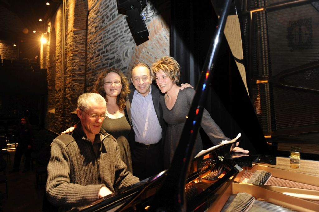 Le pianiste Yves Léveillé, la coordonnatrice aux arts de la scène Shanti Sarrazin, l’acteur et conférencier Marcel Leboeuf ainsi que la directrice générale et artistique de Diffusion culturelle Lévis, Diane Blanchette, rassemblés sur la scène de L’Anglicane pour le lancement de la programmation hiver- printemps 2011