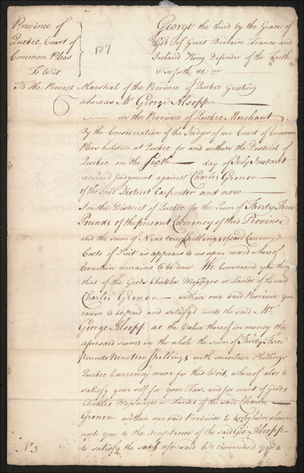 - Procès entre George Allsopp, marchand de Québec, d'une part, et Charles Grenon, charpentier dans le district de Québec, d'autre part, à propos du paiement d'une somme de 33 livres et 19 shillings en monnaie courante de la province de Québec, laquelle somme est due par ledit Grenon suivant un jugement rendu contre lui en la Cour des plaidoyers communs