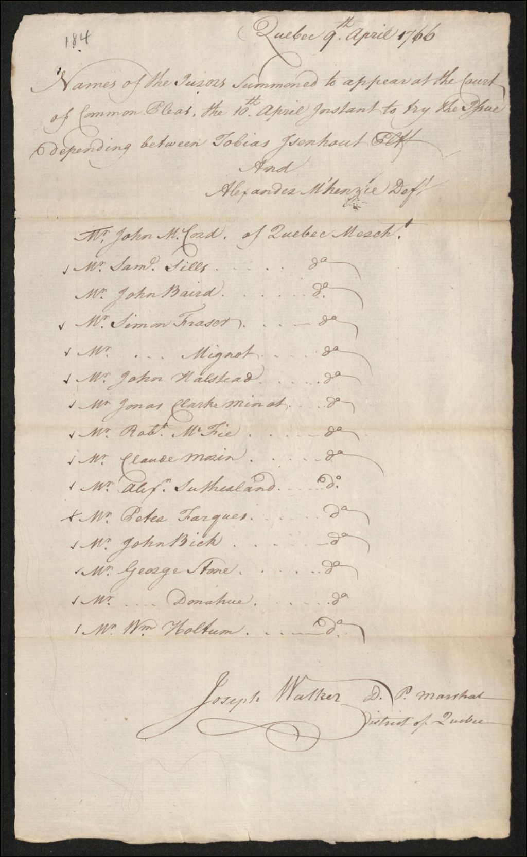 Procès entre Tobias Isenhout, d'une part, et Alexander Mackenzie, d'autre part, à propos du paiement des sommes dues par ledit Mackenzie, 10 avril 1766, Archives nationales à Québec, Fonds Cour des plaidoyers communs, (03Q,TP5,S1,SS1,D184).