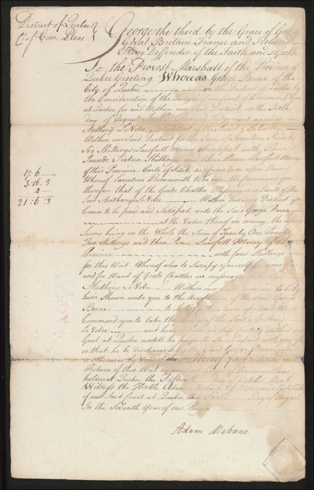 - Ce dossier en matières civiles provient de la Cour des plaidoyers communs. Il comprend un exploit de saisie contre Antoine Le Vitre (Levitre), suivant la requête de George Borne (Bornais), réclamant une somme de 21 livres, 6 shillings et 3 sols, en argent de Québec; un mandat d'assignation du sieur Le Vitre (Levitre)