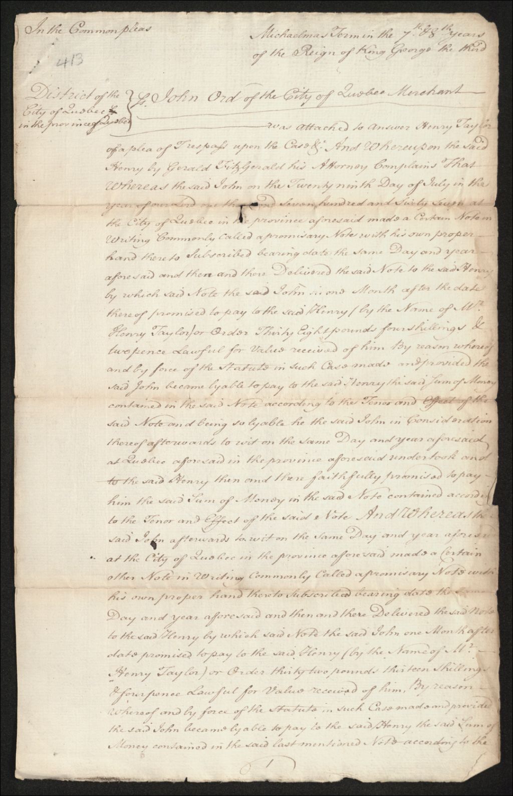 - Ce dossier en matières civiles provient de la Cour des plaidoyers communs. Il comprend une défense de John Ord, suivant une requête de Henry Taylor; un mandat d'assignation du sieur Ord