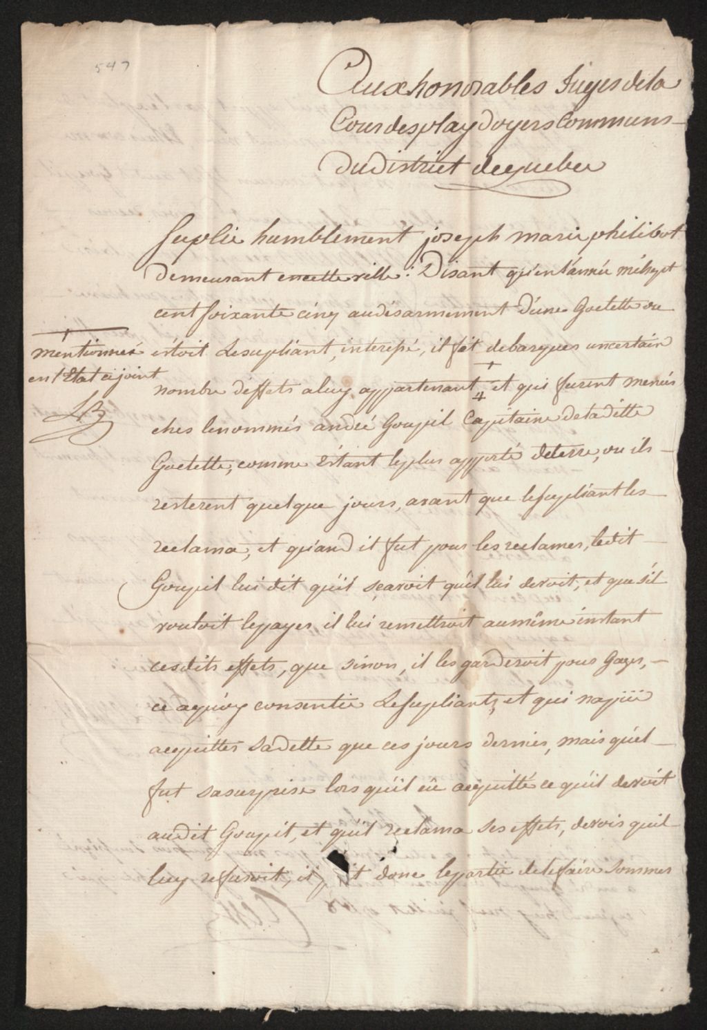 - Procès entre Joseph-Marie Philibot, demeurant rue Saint-Jean à Québec, d'une part, et André Goupil, navigateur demeurant rue du Sault-au-Matelot également à Québec, d'autre part, à propos d'effets qui ont été débarqués lors du désarmement de la goélette dont ledit Goupil est capitaine et qui ont été amenés chez ce dernier, en 1765, et que le défendeur tenait en nantissement d'une somme que ledit Philibot lui devait, refusant maintenant de remettre les effets en question malgré le fait que le demandeur s'est acquitté de sa dette