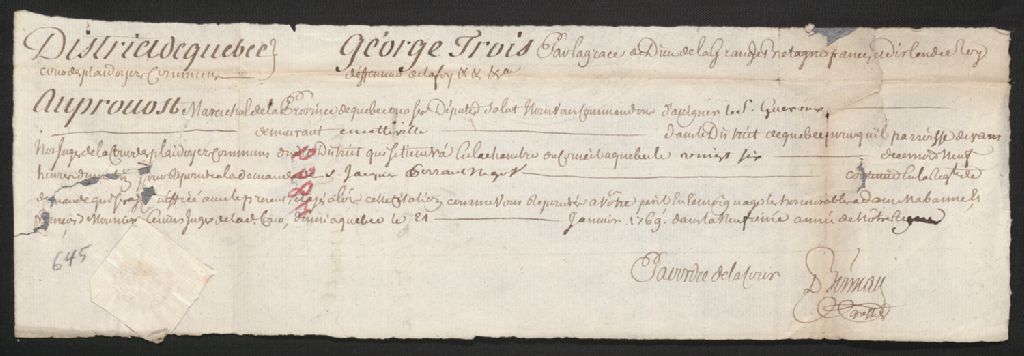 - Ce dossier en matières civiles provient de la Cour des plaidoyers communs. Il comprend un mandat d'assignation (warrant) au sieur Guéroux et un exploit d'assignation en conséquence