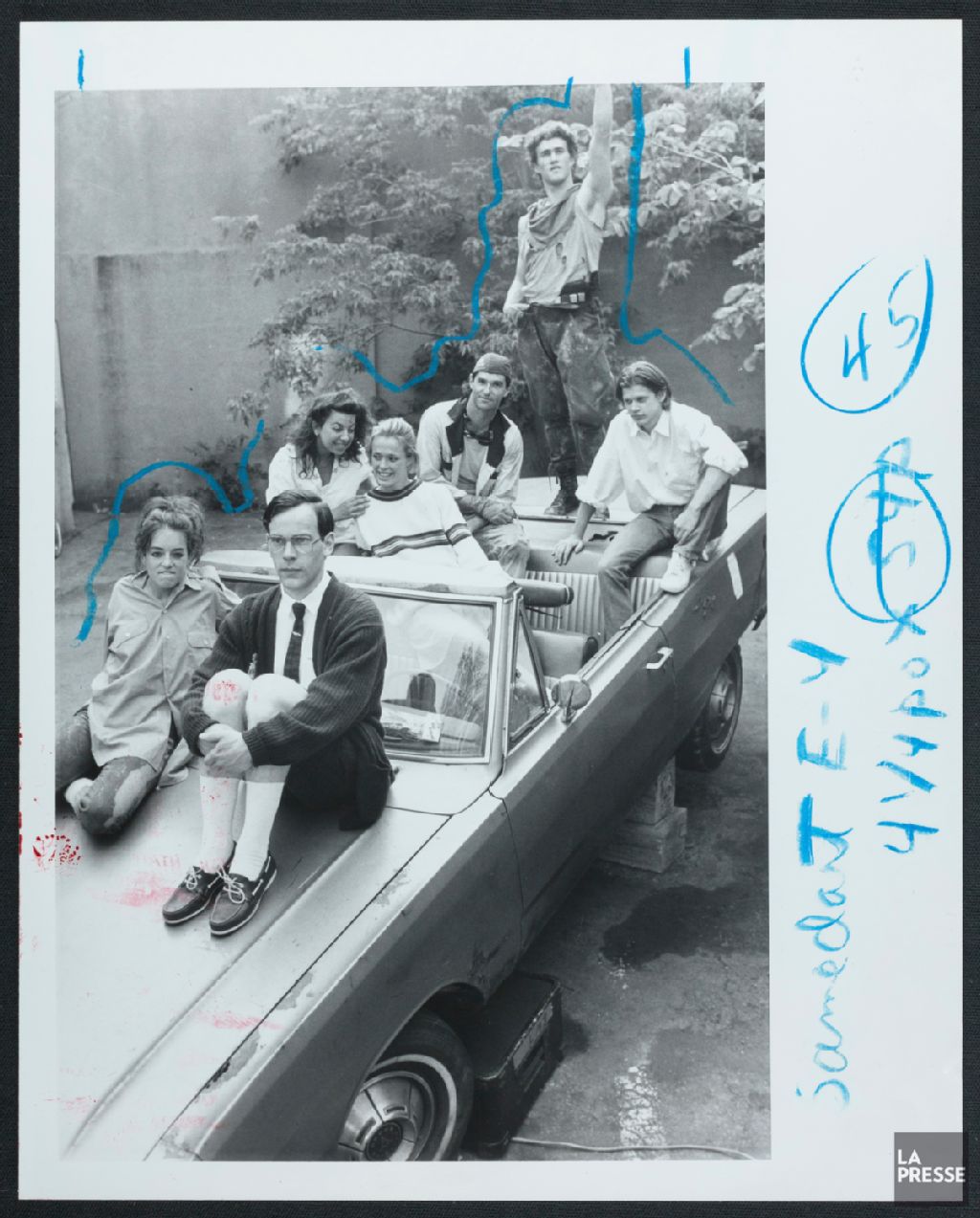 - Le document illustre Suzanne Lemoine, Vincent Houdet, Pascale Rafle, Julie Castonguay, Roger Larue, Dominic Champagne et Roy Dupuis dans une voiture décapotable