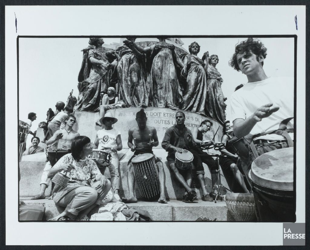 - Le dossier illustre des percussionnistes massés dans les escaliers du monument à George-Étienne Cartier. On voit une foule au pied du monument; les gens écoutent la musique et dansent