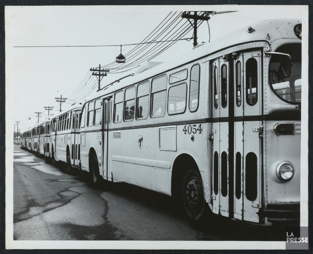 - Le dossier montre un groupe d¿hommes posant à l'occasion du premier départ d¿un trolleybus ainsi qu¿une flotte d¿autobus stationnés