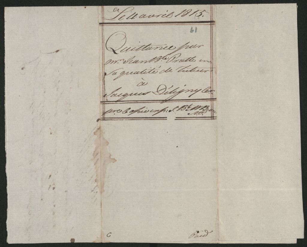 Quittance par Jean-Baptiste Pratte, comme tuteur de l'enfant naturel de feu Antoine Amable Piette, à Jacques Deligny., 4 avril 1815, Archives nationales à Québec, Collection Seigneuries, (03Q,P240,D31,P18).