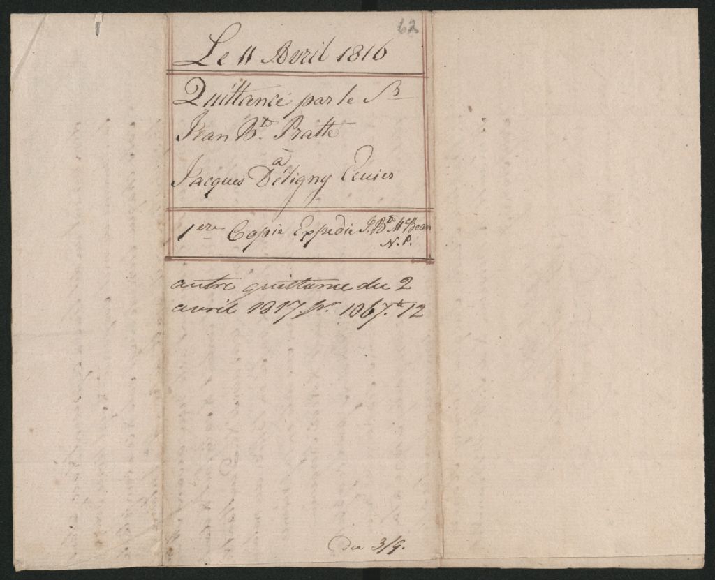 Quittance par Jean-Baptiste Pratte, comme tuteur de l'enfant naturel de feu Antoine Amable Piette, à Jacques Deligny., 11 avril 1816, Archives nationales à Québec, Collection Seigneuries, (03Q,P240,D31,P19).