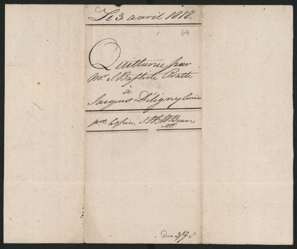 Quittance par Jean-Baptiste Pratte, comme tuteur de l'enfant naturel de feu Antoine Amable Piette, à Jacques Deligny., 3 avril 1818, Archives nationales à Québec, Collection Seigneuries, (03Q,P240,D31,P20).