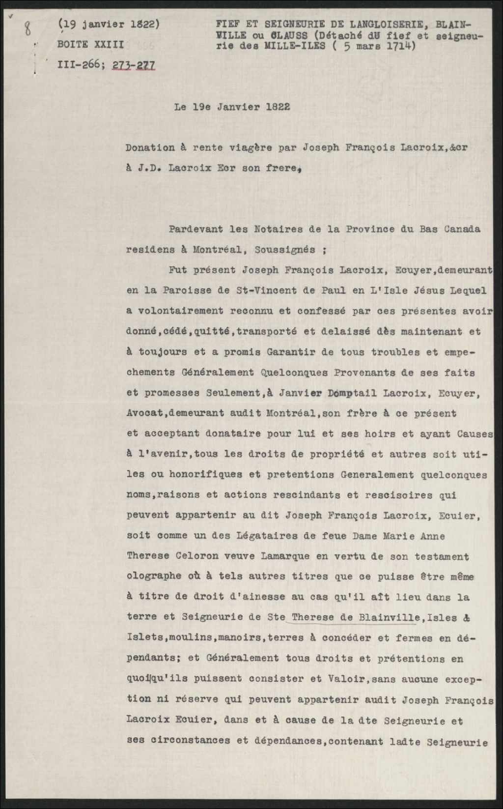 - Donation impliquant Joseph François Lacroix et Janvier Domptail Lacroix : donation à rente viagère.