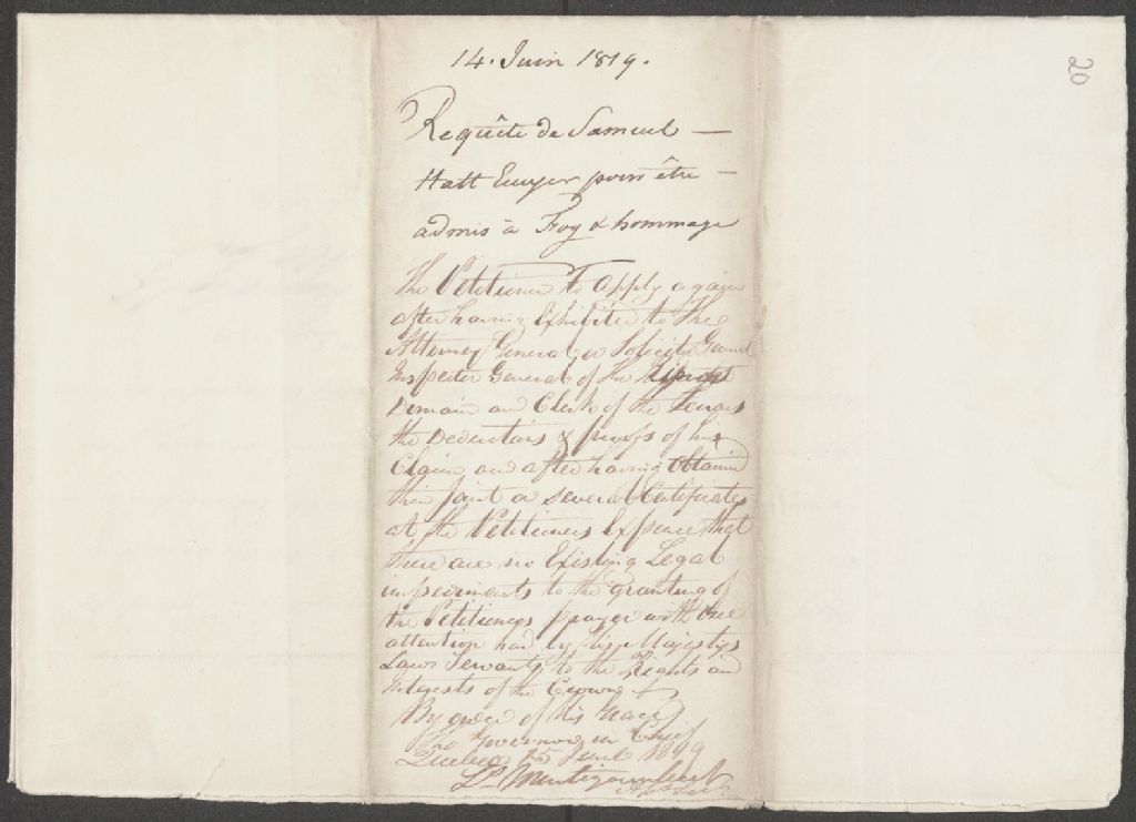 - Requête de Samuel Hatt pour être admis à la foi et hommage.