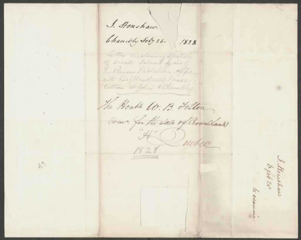 Lettre de Joshua Henshaw à W. B. Felton: requête pour obtenir une île sur la rivière Richelieu., 6 février 1828, Archives nationales à Québec, Collection Seigneuries, (03Q,P240,D53,P24).