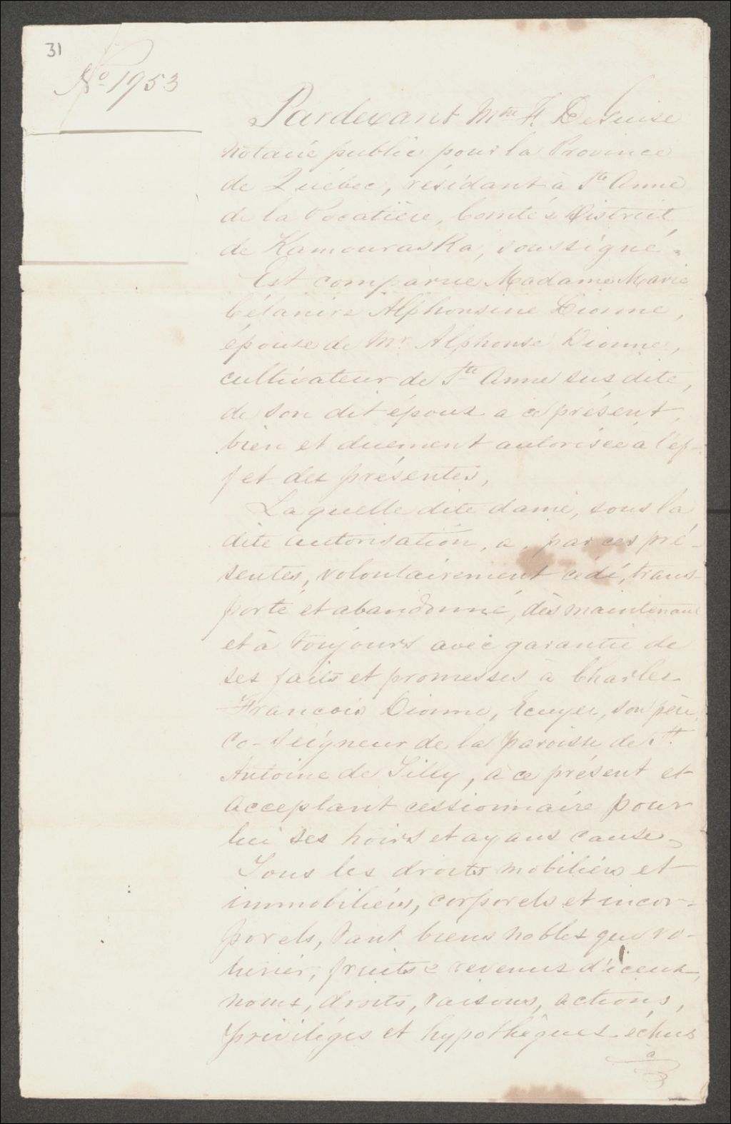 - Cession par Alphonsine Dionne à Charles-François Dionne.