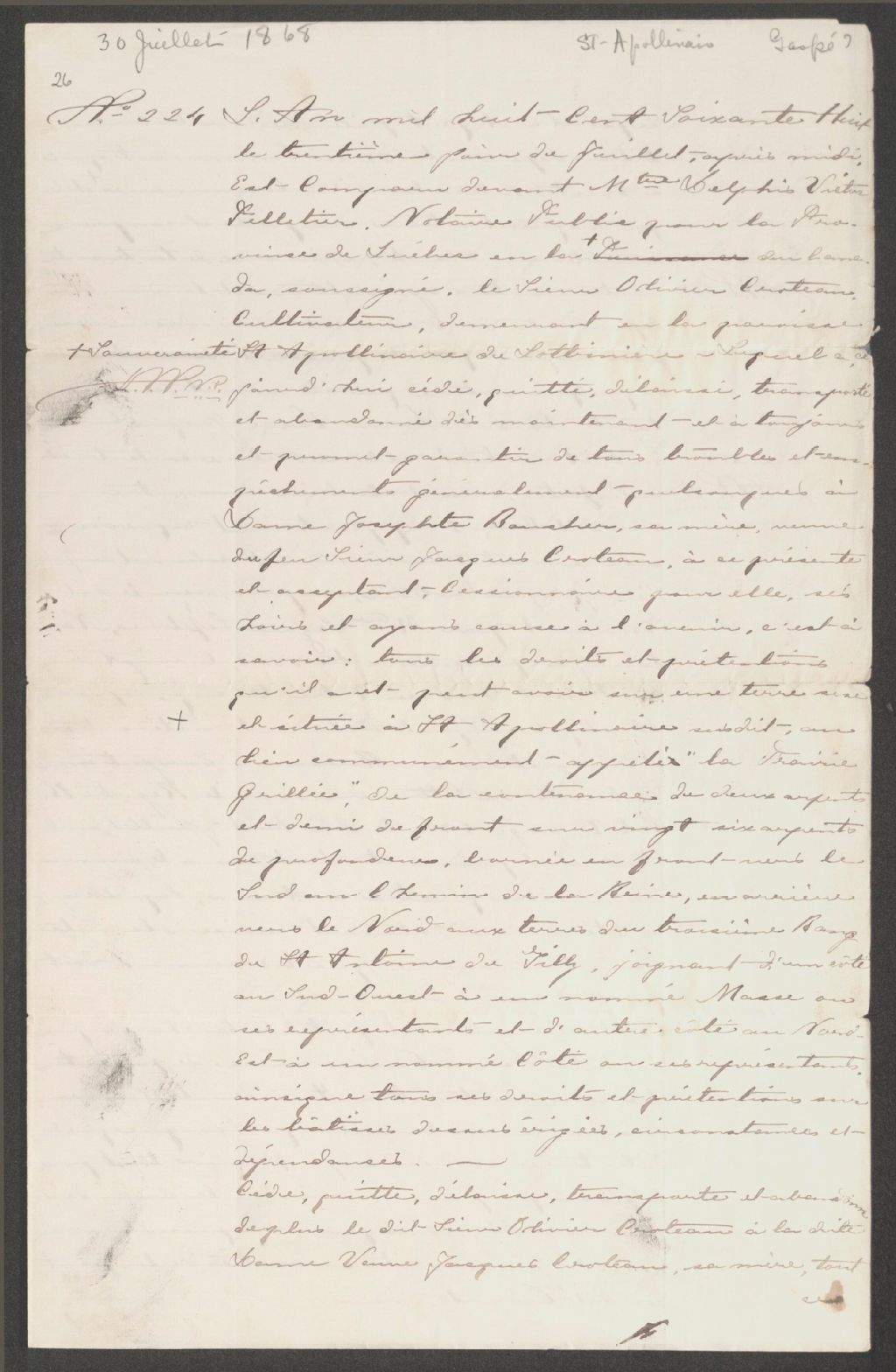 Cession par Olivier Croteau à Josephte Boucher, veuve de Jacques Croteau., 30 juillet 1868, Archives nationales à Québec, Collection Seigneuries, (03Q,P240,D98,P26).