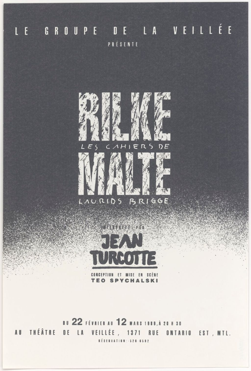 Le Groupe de la Veillée présente Rilke, Les cahiers de Malte Laurids Bridge : interprété par Jean Turcotte, conception et mise en scène Teo Spychalski