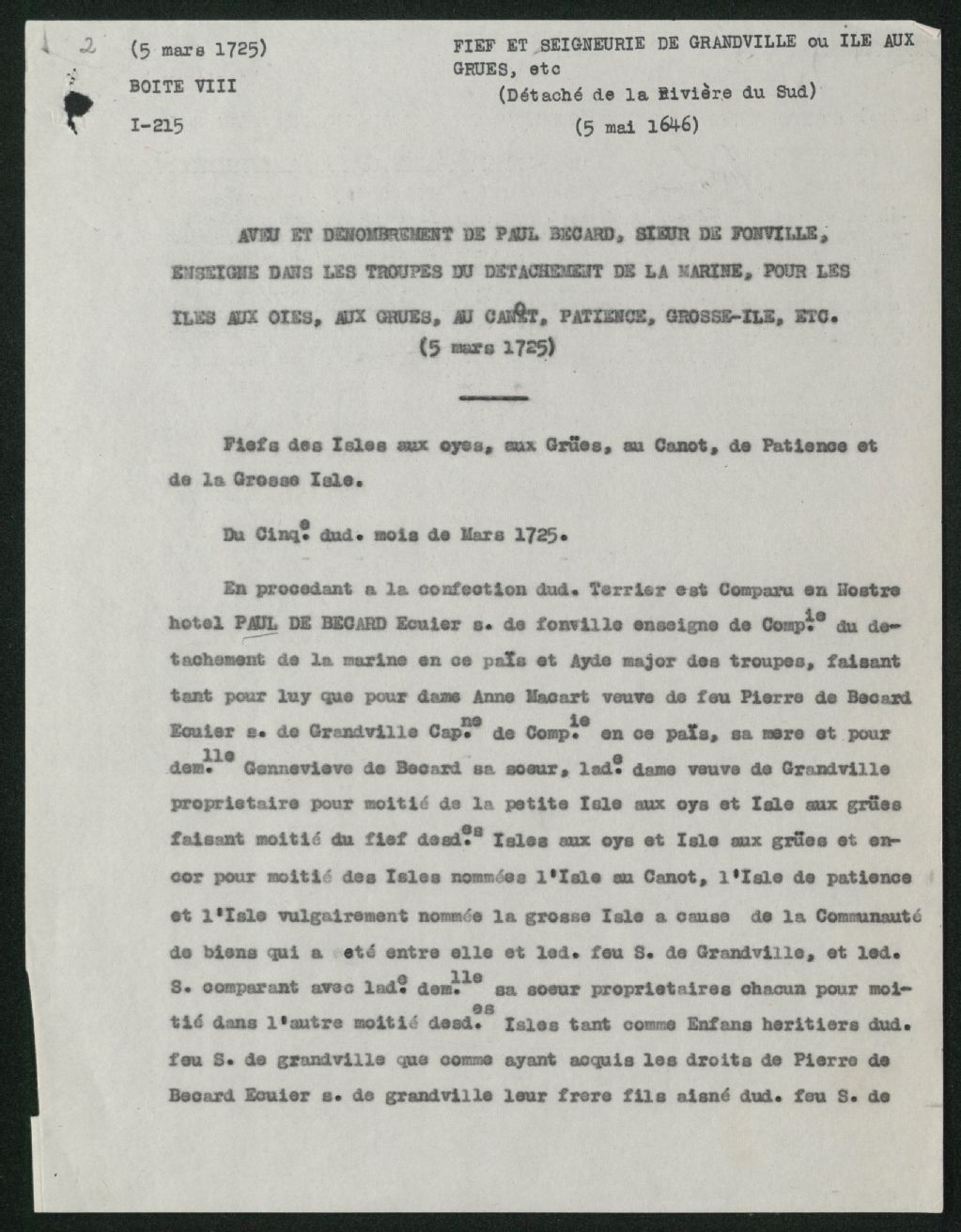 Aveu et dénombrement de Paul Bécard, sieur de Fonville, enseigne dans les troupes du détachement de la marine, pour les îles aux Oies, aux Grues, au Canet, Patience, Grosse-Ïle, etc., Copie dactylographiée en [19-] (original créé le 5 mars 1725), Archives nationales à Québec, Collection Seigneuries, (03Q,P240,D113,P2).