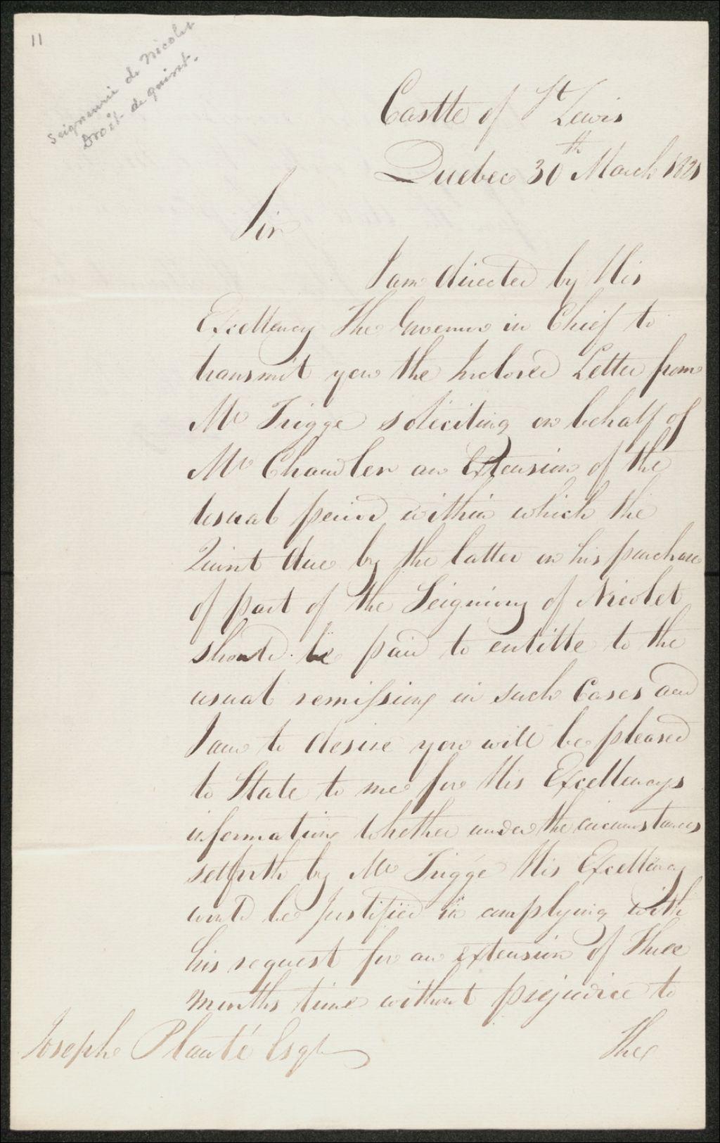 Réponse à la requête impliquant M. Chandler : Extension du délai pour paiement du droit de quint. Cette lettre est adressée à Joseph Plante, 30 mars 1821, Archives nationales à Québec, Collection Seigneuries, (03Q,P240,D184,P11).