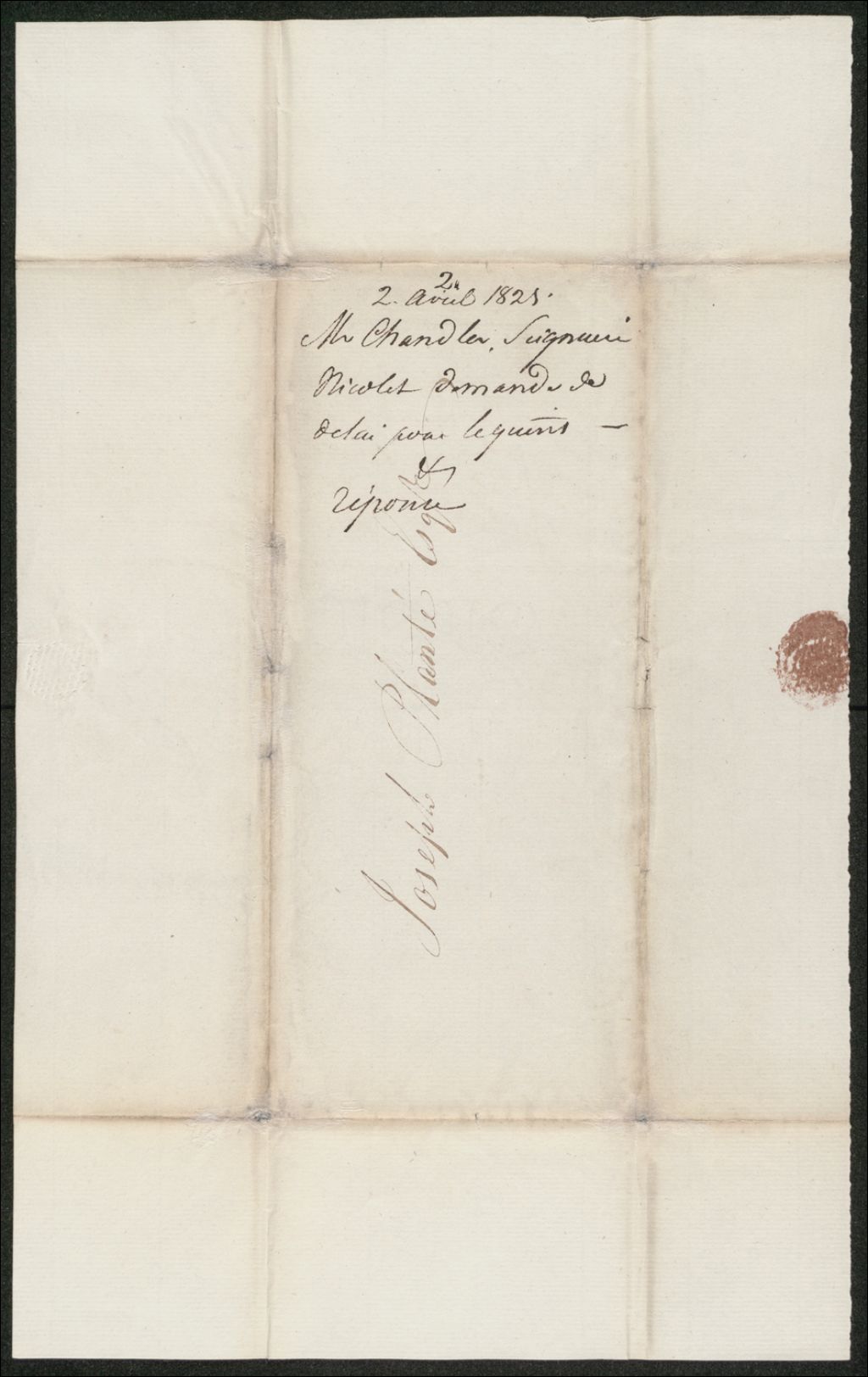 Lettre de Kenelm Conor Chandler à Joseph Plante: délai pour paiement de droit de quint, 2 avril 1821, Archives nationales à Québec, Collection Seigneuries, (03Q,P240,D184,P13).
