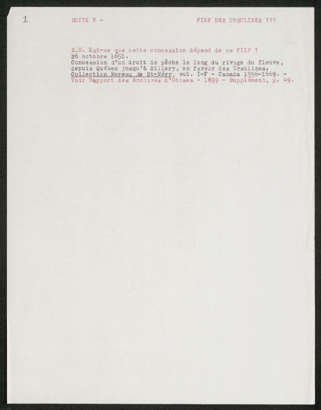 Documents de travail : Référence à la concession d'un droit de pêche le long du fleuve le 26 octobre 1651 en faveur des Ursulines, [18-?], Archives nationales à Québec, Collection Seigneuries, (03Q,P240,D302,P1).