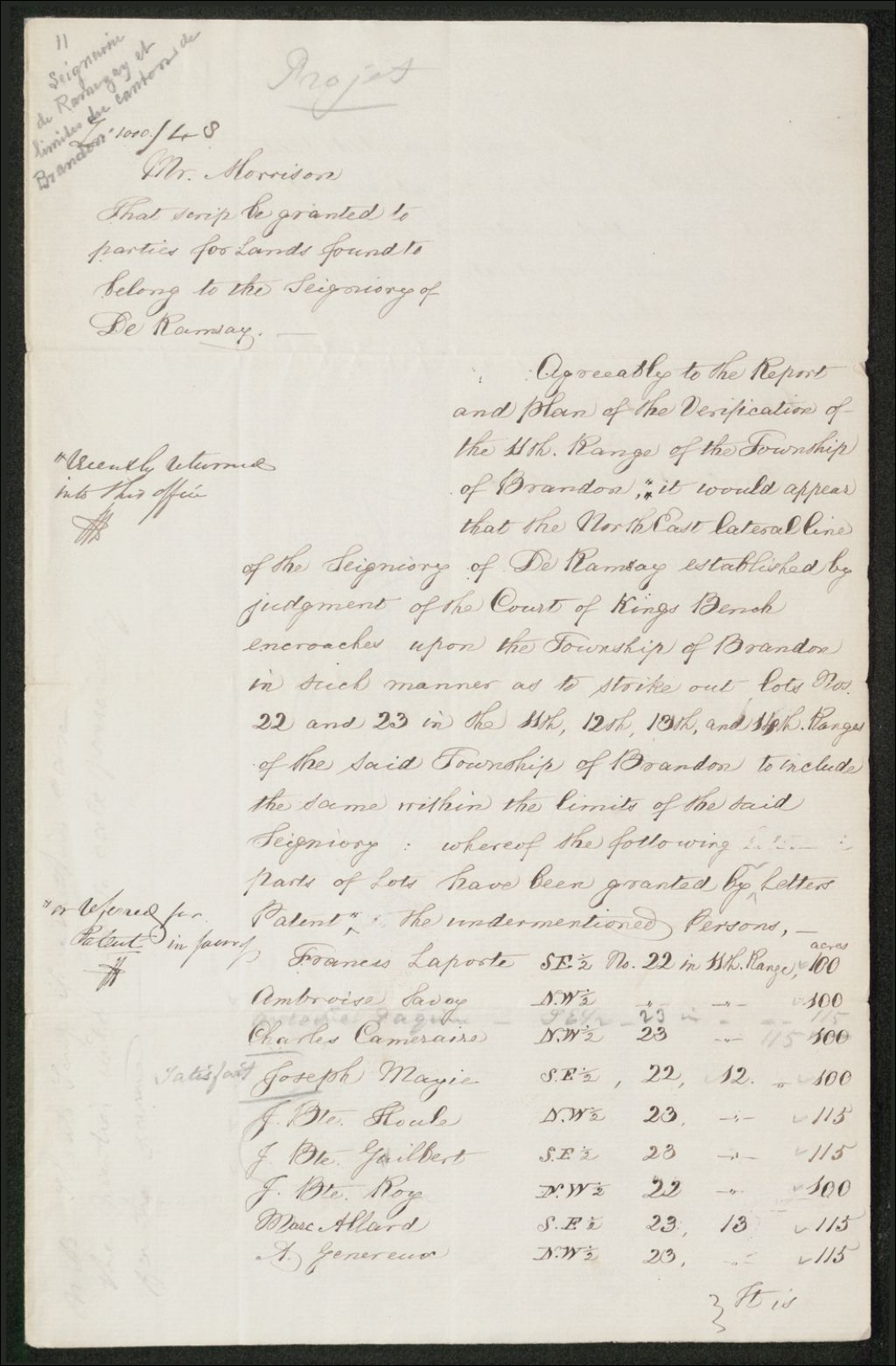 Rapport impliquant William Morrison et al. : erreur dans la délimitation et l'arpentage de la seigneurie de Ramezay., [Après 1848], Archives nationales à Québec, Collection Seigneuries, (03Q,P240,D238,P11).