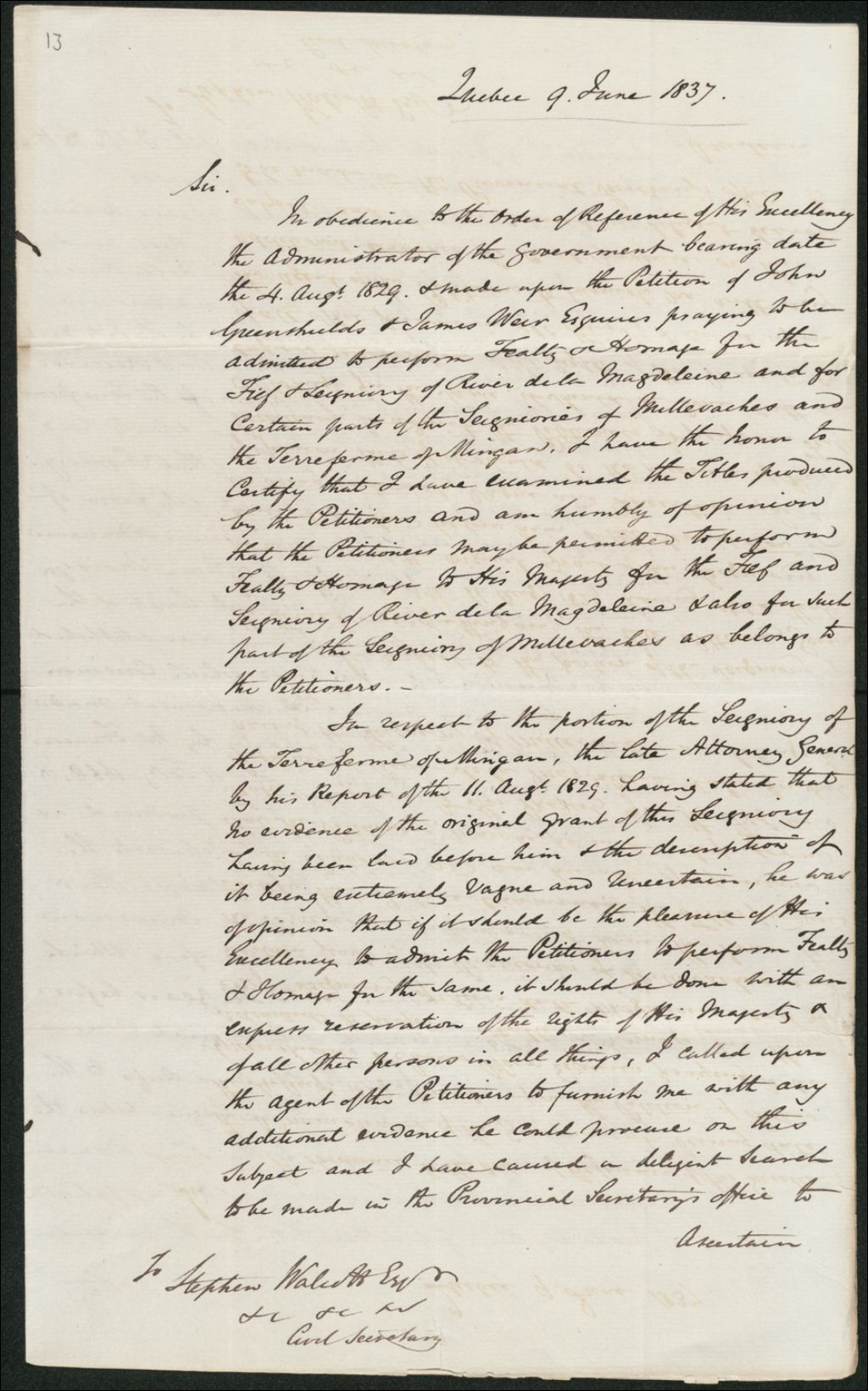 Réponse à la requête de John Greenshields et de James Weir : Admission à la foi et hommage, 9 juin 1837, Archives nationales à Québec, Collection Seigneuries, (03Q,P240,D210,P13).
