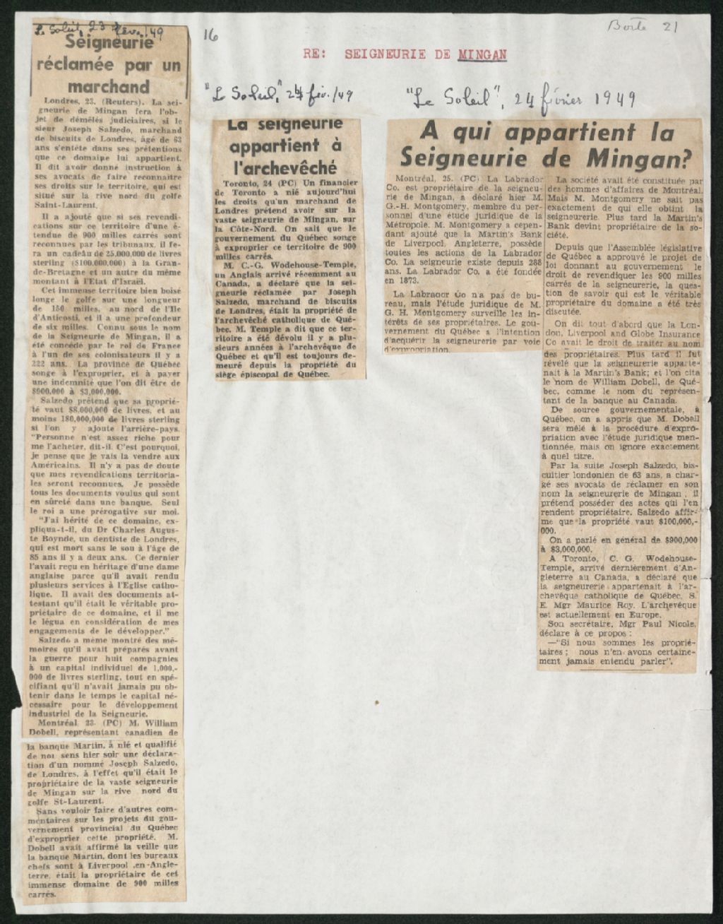 Coupures de presse concernant la seigneurie de Mingan provenant du journal Le Soleil