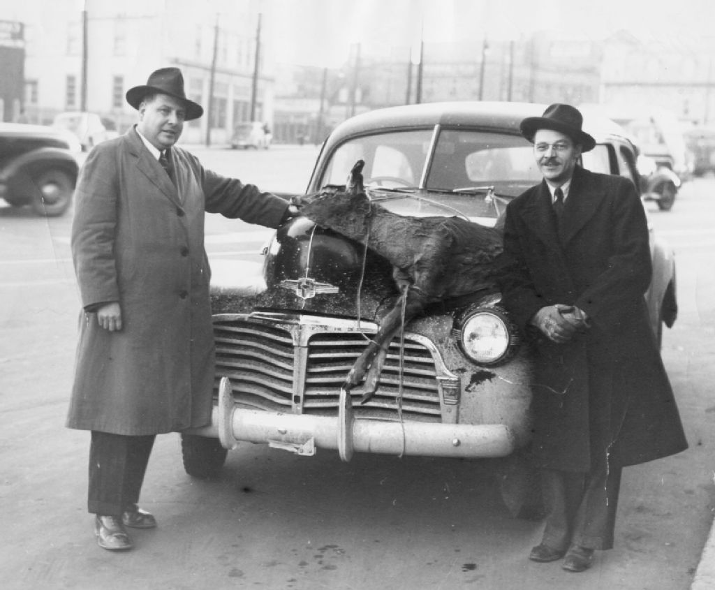 Reproduction d'une photographie prise au retour d'une partie de chasse. On peut voir un homme en compagnie du père de Micheline Labranche. Derrière eux on peut voir la carcasse d'un chevreuil attaché sur une automobile. La photographie a été prise en hiver.