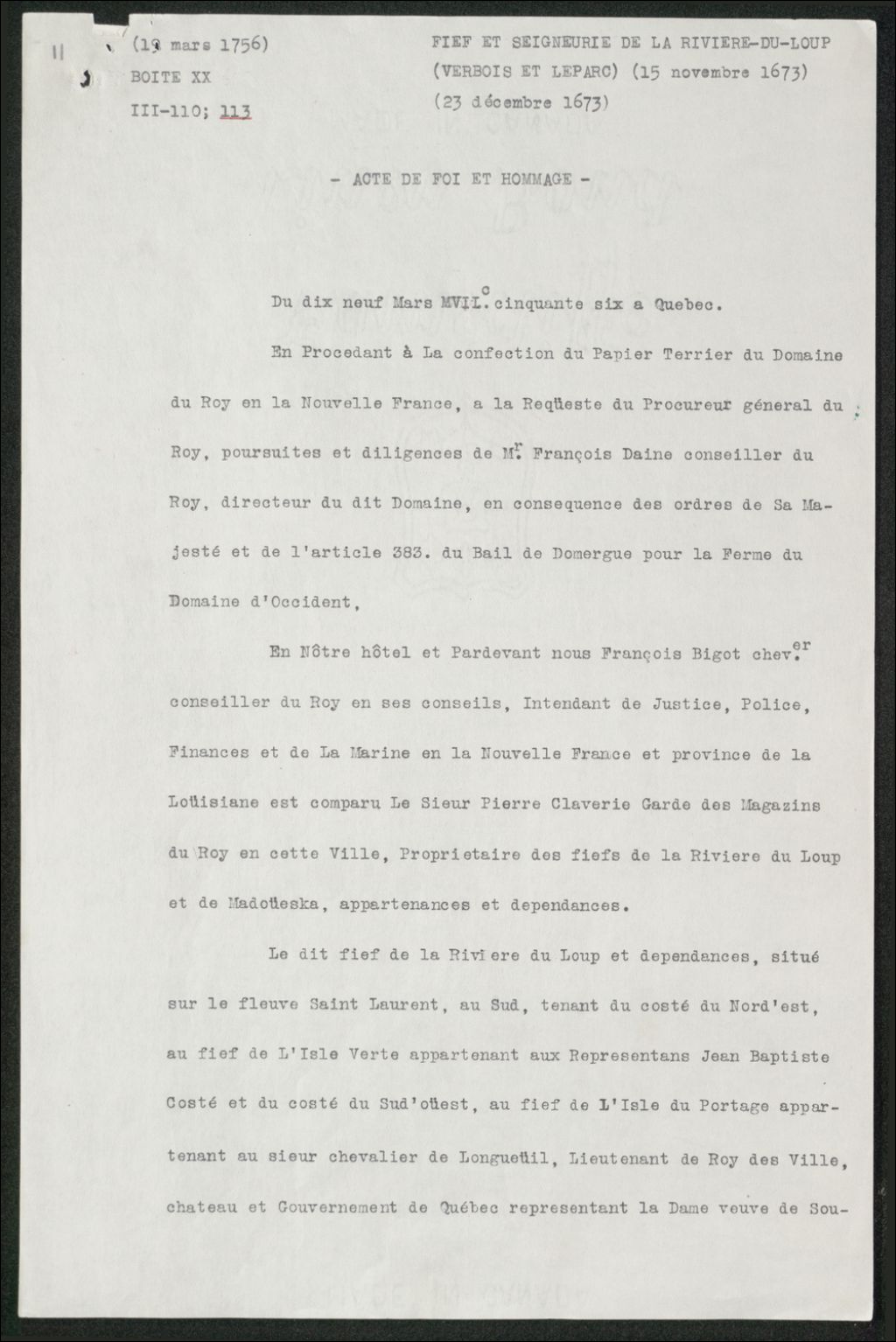 - Acte de foi et hommage de Pierre Claverie, garde des magasins du Roi à Québec