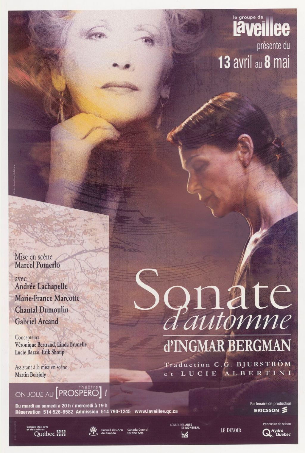 Le Groupe de la veillée présente ... Sonate d'automne, d'Ingmar Bergman, traduction C.G. Bjurström et Lucie Albertini, mise en scène Marcel Pomerlo avec Andrée Lachapelle, Marie-France Marcotte, Chantal Dumoulin ...