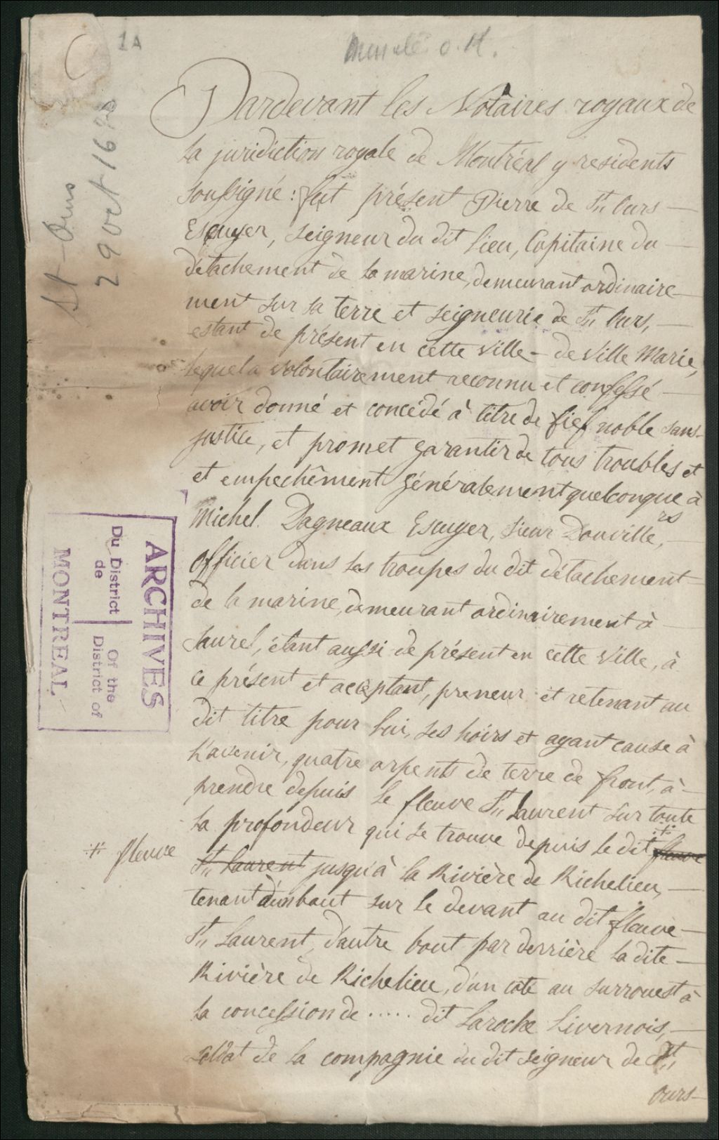 Acte de concession de Pierre de Saint-Ours à Michel Dagneaux, sieur Douville, officier dans les troupes du détachement de la marine, de"quatre arpents de terre de front, dans sa seigneurie de Saint-Ours, à prendre depuis le fleuve St-Laurent sur toute la profondeur qui se trouve depuis le dit fleuve jusqu'à la rivière Richelieu, tenant, d'un bout, sur le devant, au dit fleuve St-Laurent, d'autre bout, par derrière, la dite rivière de Richelieu, d'un côté, au sorrouest, à la concession du nommé Laroche Livernois, soldat de la Cie du seigneur de St-Ours, et d'autre côté, au nordest, aux terres du dit seigneur non concédées... la dite concession à titre de fief noble sans justice"