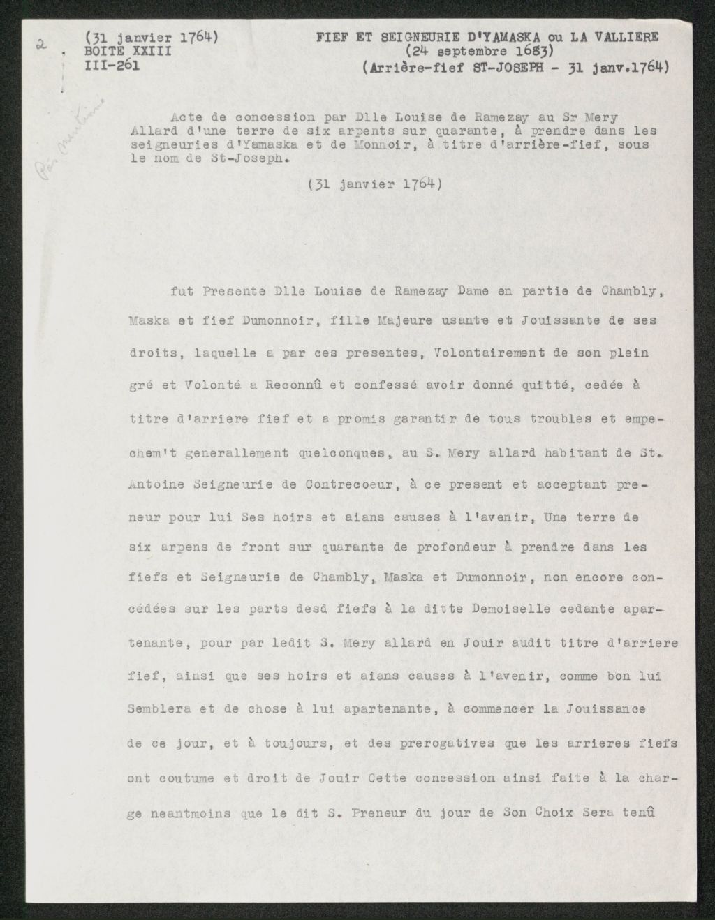 Concession par Louise de Ramezay à Mery Allard : Arrière-fief de St-Joseph (seigneurie d'Yamaska), 31 janvier 1764, Archives nationales à Québec, Collection Seigneuries, (03Q,P240,D315,P2).
