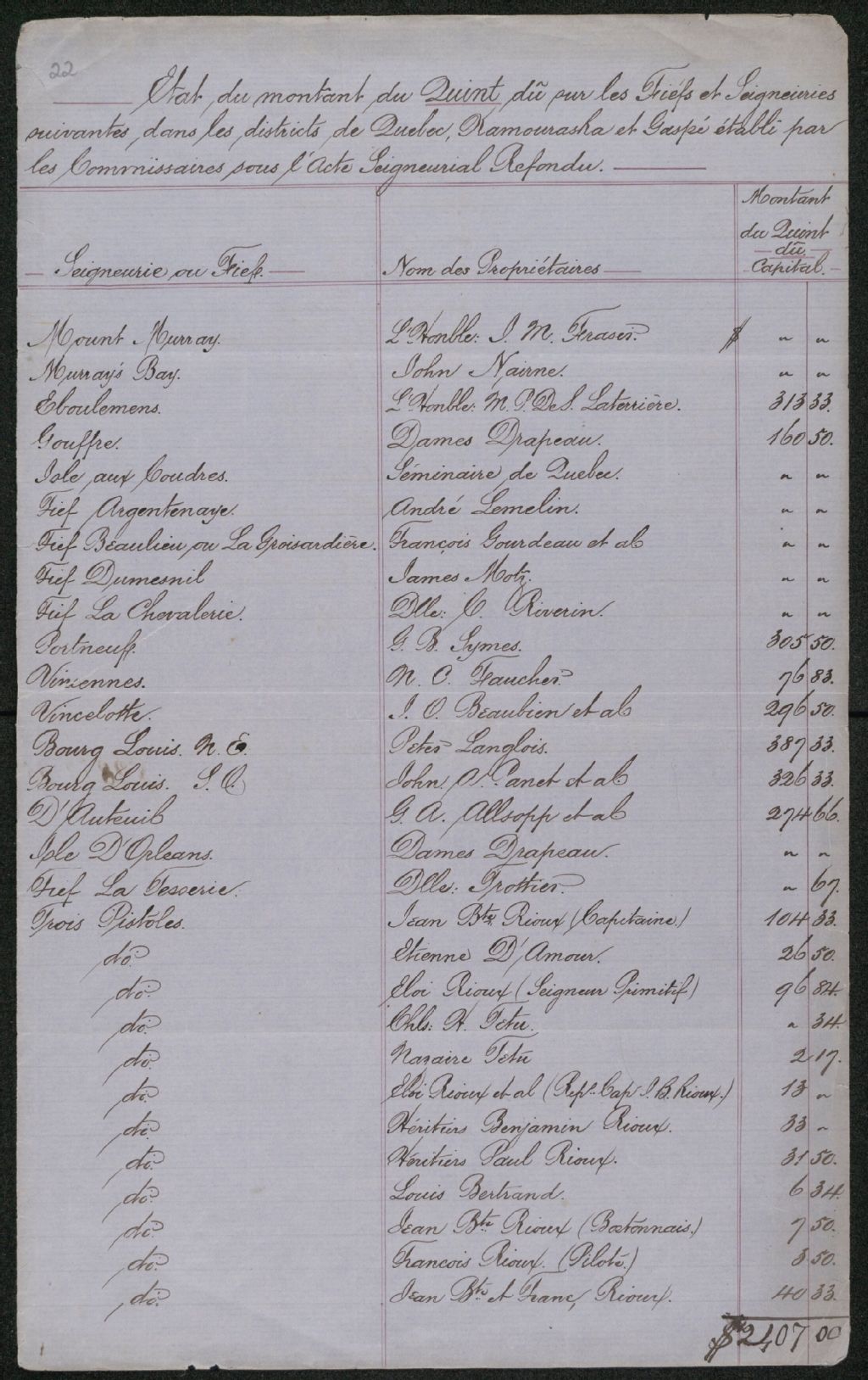 Compte : État du montant du quint dû sur les fiefs et seigneuries des districts de Québec, Kamouraska et Gaspé établi par les commissaires sous l'Acte seigneurial refondu, 26 mai 1862, Archives nationales à Québec, Collection Seigneuries, (03Q,P240,D316,P22).