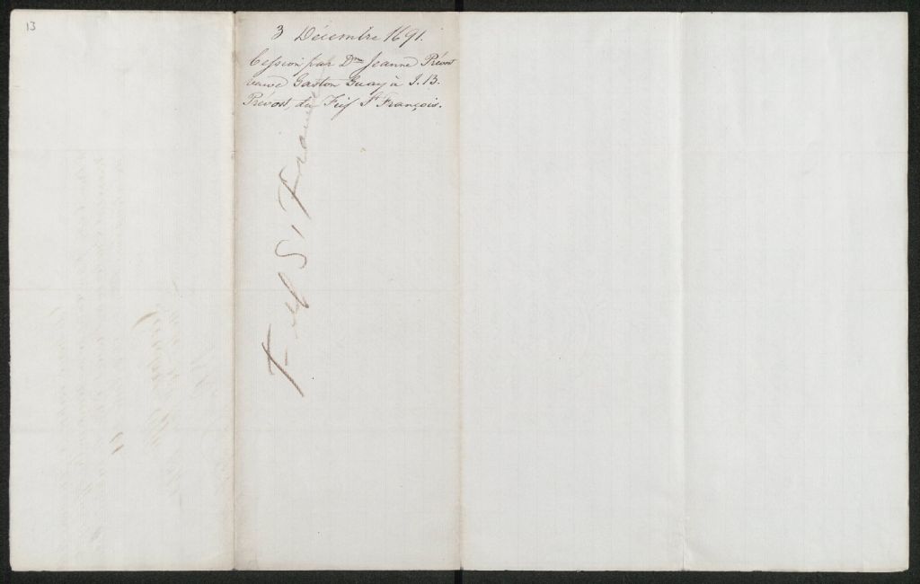 Acte de cession et transport de Jeanne Prévost, veuve de Gaston Guay, à Jean-Baptiste Prévost et Marie Giroux, sa femme, de la terre et fief de Saint-François, 3 décembre 1691, Archives nationales à Québec, Collection Seigneuries, (03Q,P240,D334,P13).