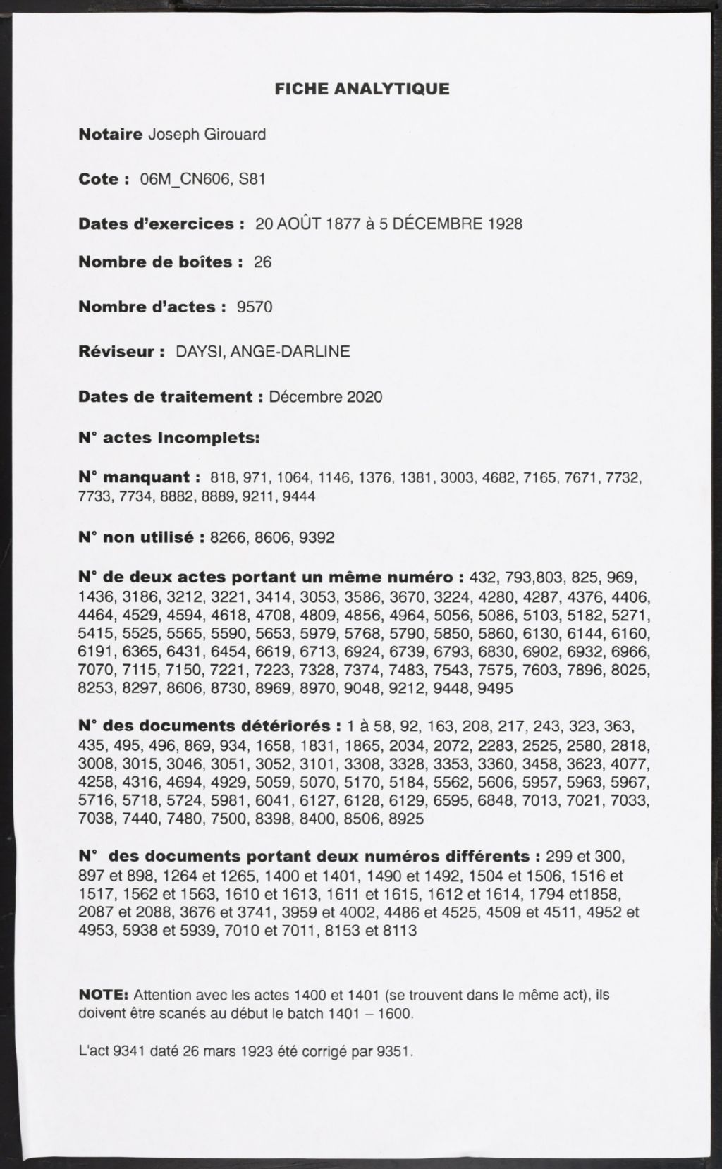 Joseph Girouard, 1877-1928, Archives nationales à Montréal, Fonds Cour supérieure. District judiciaire de Terrebonne. Greffes de notaires, (06M,CN606,S81).