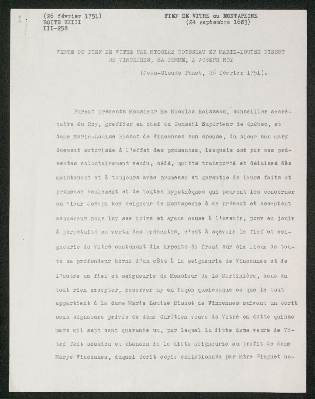 Vente du fief de Vitré par Nicolas Boisseau et Marie-Louise Bissot à Joseph Roy, 26 février 1751, Archives nationales à Québec, Collection Seigneuries, (03Q,P240,D313,P1).