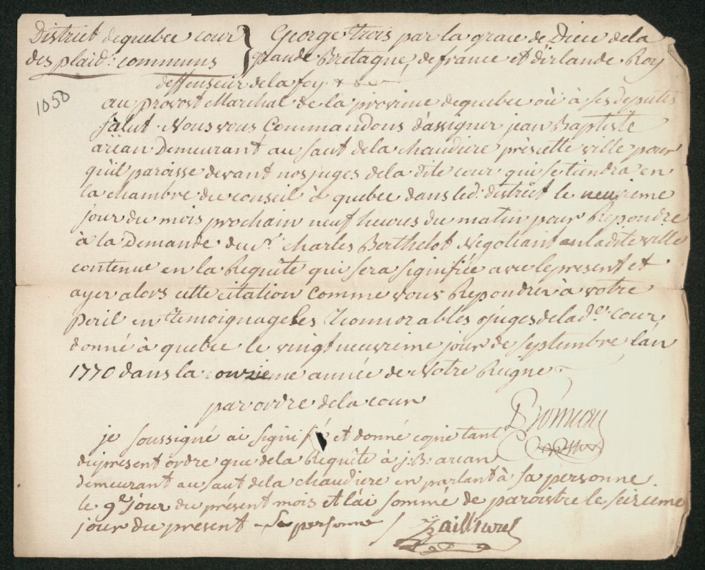 - Procès entre Charles Berthelot, négociant de la ville de Québec, d'une part, et Jean-Baptiste Arcan (Arcand), habitant du Sault de la Chaudière, près de la ville de Québec, d'autre part, à propos d'une somme de 327 shillings et 3 sols en monnaie courante pour fournitures faites au défendeur tant en argent comptant qu'en marchandises