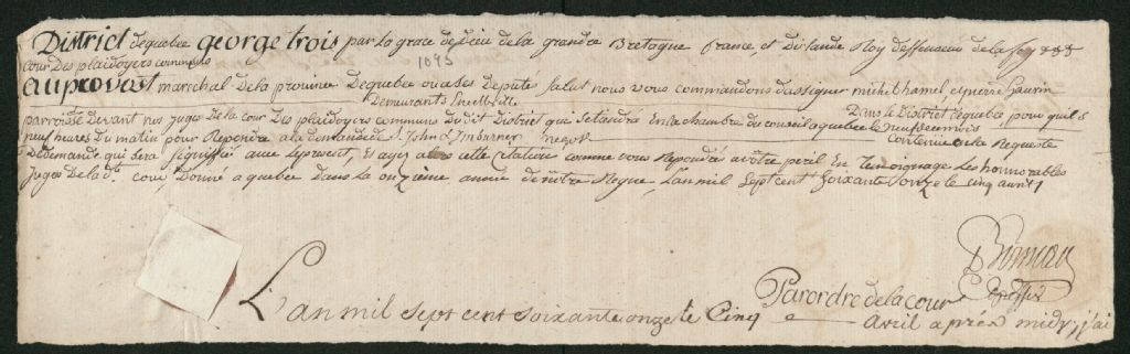 - Procès entre John Lymburner, négociant en la ville de Québec, y demeurant, rue Saint-Pierre, d'une part, et Michel Hamel et Pierre Gauvin, d'autre part, à propos du paiement d'une somme de 600 shillings de la province de Québec, contenue dans un billet de Charles Liard, daté du 16 mars 1770, dont le paiement est échu et dû audit Lymburner, et duquel paiement lesdits Hamel et Gauvin se sont portés garants (caution)