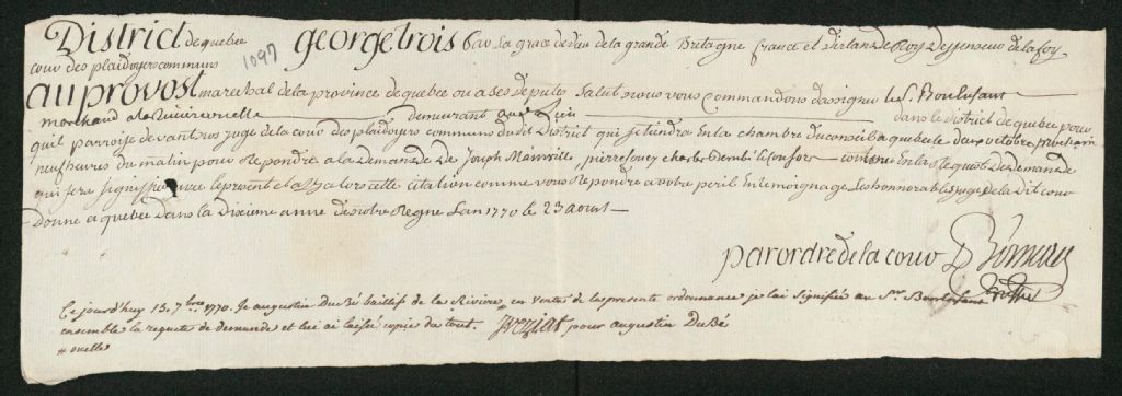 Procès entre Joseph Mainville (Miville), Pierre Soucy, Charles Bérubé, Jean-Baptiste Lévesque et consorts, tous habitants de la seigneurie de la Rivière-Ouelle, comparant par maître Panet, avocat, d'une part, et Jean-Baptiste Bonenfant, bailli à la Rivière-Ouelle, au nom et comme fermier des héritiers Boisbert (Boishébert), seigneurs de la Rivière-Ouelle, comparant par maître Saillant, avocat, d'autre part, à propos du chemin du moulin qu'a fait construire ledit Bonenfant à la Rivière-Ouelle, 23 aôut 1770 - 24 décembre 1771, Archives nationales à Québec, Fonds Cour des plaidoyers communs du district de Québec, (03Q,TL24,S1,D1097).