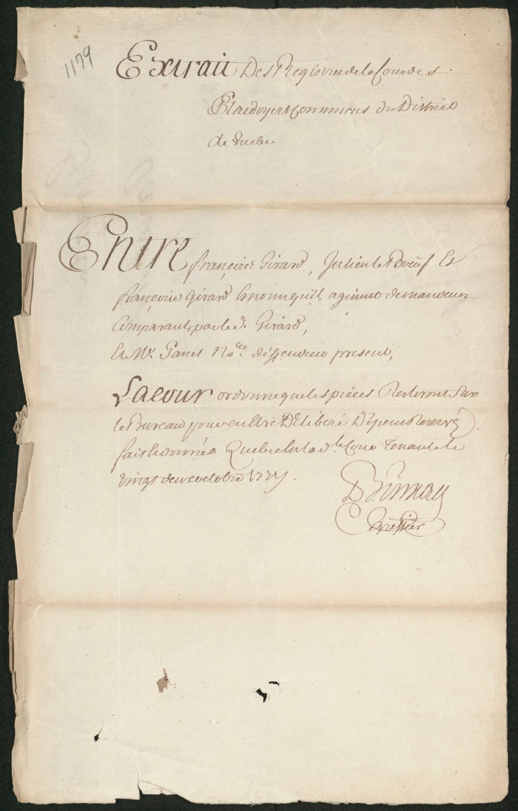 - Ce dossier en matières civiles provient de la Cour des plaidoyers communs. Il comprend un procès-verbal de vente des biens meubles et effets dépendants de la succession de feue Marie Girard ; un mandat d'assignation (warrant) à maître Panet, notaire ; un exploit d'assignation en conséquence ; une requête de François Girard et consorts réclamant que leur soit rendu des comptes de la succession de feu Marie Girard ; une permission de faire assigner ; les débats fournis par François Girard et consorts ; un compte fourni par maître Panet ; une ordonnance de la Cour à l'effet que les pièces resteront sur le bureau pour en être délibéré ; et un soutènement de compte produit par Jean-Claude Panet