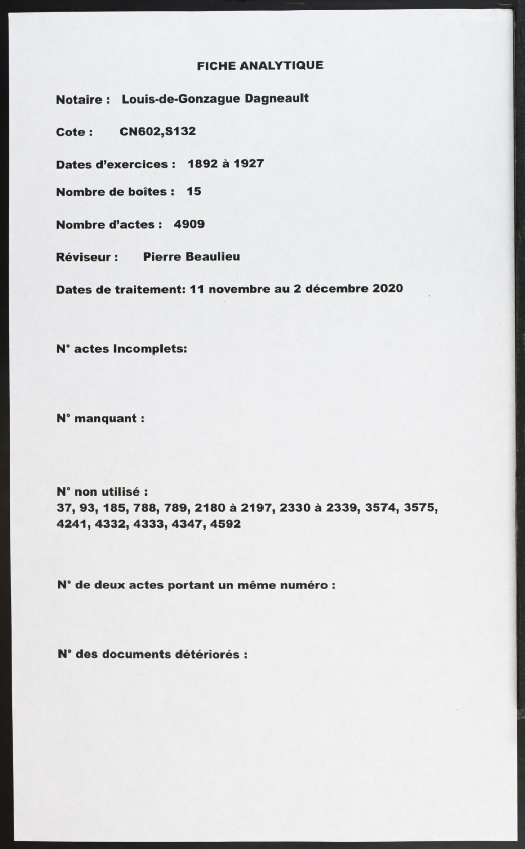 Louis-de-Gonzague Dagneault, 1892-1927, Archives nationales à Montréal, Fonds Cour supérieure. District judiciaire de Saint-Hyacinthe. Greffes de notaires, (06M,CN602,S132).