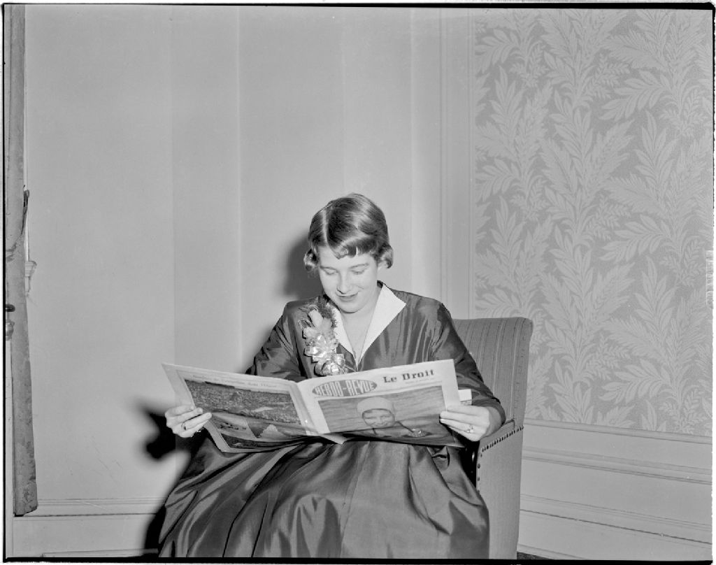 Marilyn Bell au Château Laurier, 2 novembre 1954, Archives nationales à Gatineau, Fonds Champlain Marcil, (07H,P174,S1,D4169), Attribuée à Champlain Marcil.