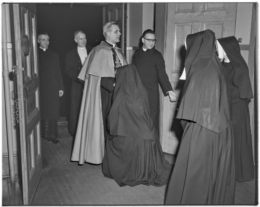 Visite du Cardinal Paul-Émile Léger chez les Soeurs de la Charité de Namur, 15 octobre 1953, Archives nationales à Gatineau, Fonds Champlain Marcil, (07H,P174,S1,D2157), Attribuée à Champlain Marcil.